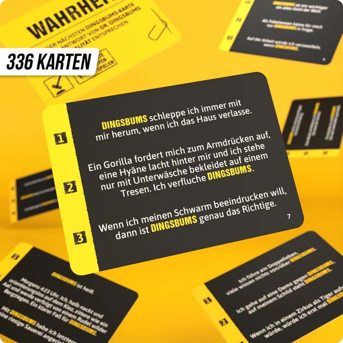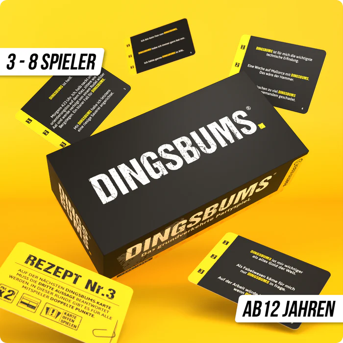 Das grundverkehrte Partyspiel ist das erste Spiel aus der Partyfieber-Serie von DENKRIESEN und hat 336 Karten mit insgesamt 900 einmaligen, verrückten und lustigen Sätzen an Bord. Ersetzt das „DINGSBUMS“ in den Aussagen mit kreativen und lustigen Antworten und findet heraus, welcher Text von Dr. DINGSBUMS stammt. Dieses Spiel garantiert mitreißenden Partyspaß für den nächsten Spieleabend und ist ideal zum Raten, Täuschen, Tarnen und Rätseln. Einfach zu verstehen, kommt DINGSBUMS mit eindeutig hohem Suchtfaktor für Jung und Alt. Dank enthaltenem Spielblock und Bleistiften für bis zu 8 Spieler steht sofortigem Spielspaß nichts im Wege. Also, worauf noch warten?
