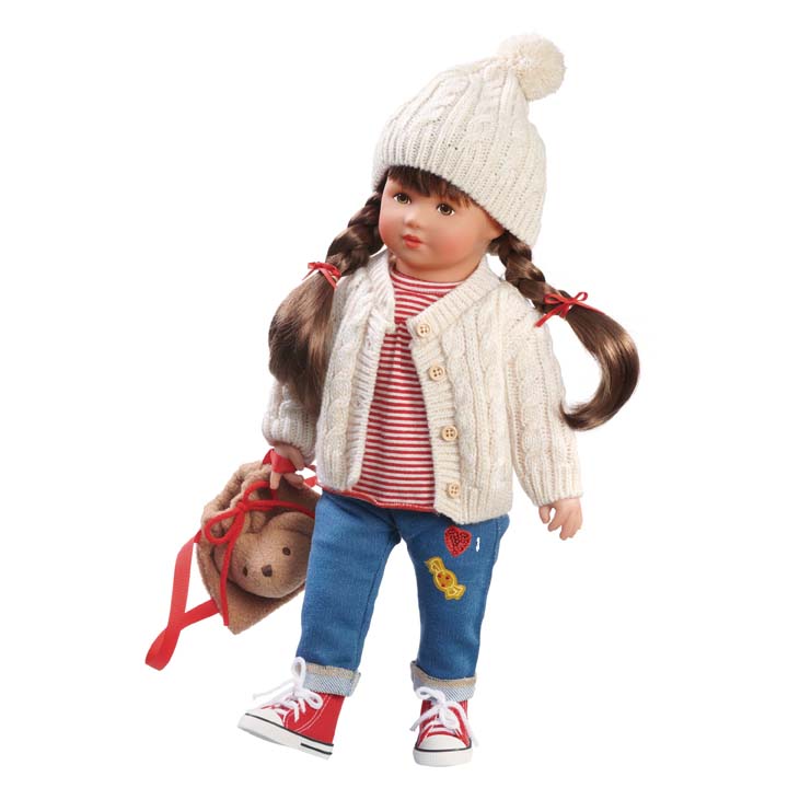Glückskind Arianna ist eine 39 cm große Spielpuppe. Sie hat einen weichen Stoffkörper der mit Polyesterwatte gefüllt ist. Die Arme, Beine und der Kopf sind aus hochwertigem Vinyl. Das Gesicht ist gemalt und die Haare aus Kanekalon können einfach frisiert werden. Arianna will heute Kastanien sammeln. Sie hat sich dazu mit Jeans, Strickjacke und Bommelmütze, warm und praktisch angezogen. Falls es doch zu warm ist trägt sie darunter noch ein rotes Ringelshirt mit Langarm. Ihre Kastanien kann sie gleich in den Rucksack packen. Für Kinder ab 3 Jahren geeignet.
