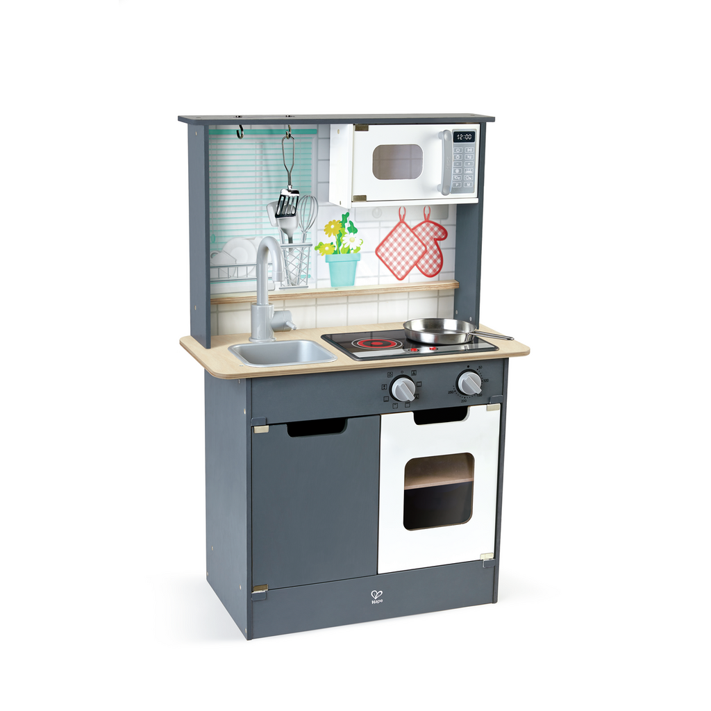 Kochen wie die Großen: Dank beleuchteter Herdplatte, realistischen Kochgeräuschen und Drehknöpfen sorgt die Spielküche für ein authentisches Spielerlebnis. Mikrowelle und Pfanne sind ebenfalls enthalten.