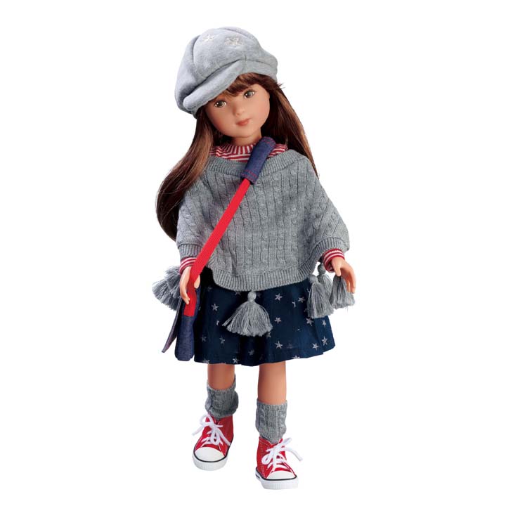 La Bella Aimee ist eine 42 cm große Stehpuppe aus hochwertigem Vinyl. Sie hat handbemalte braune Augen und lange, glänzend braune Haare mit Pony aus Kanekalon. Sie trägt ein modisches Kleid bestehend aus einem Oberteil in rot gestreiften Singlejersey mit angesetztem Faltenrock in marine mit Sternendruck. Darüber hat sie einen gestrickten grauen Poncho, dazu passende Strickstulpen und eine Schildmütze. Ihre Collegetasche und die roten Chucks machen das Outfit komplett. Für Kinder ab 3 Jahren geeignet.