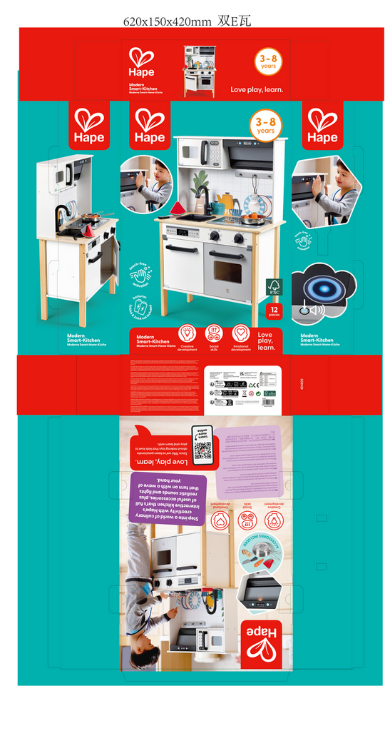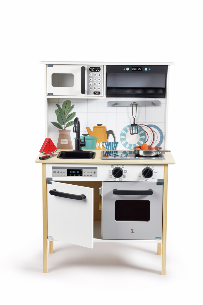 Mit der interaktiven, gut ausgestatteten Küche von Hape, realistischen Soundeffekten und einer Beleuchtung, die sich bei Bewegung automatisch einschaltet, tauchst du in die kreative Welt des Kochens ein.