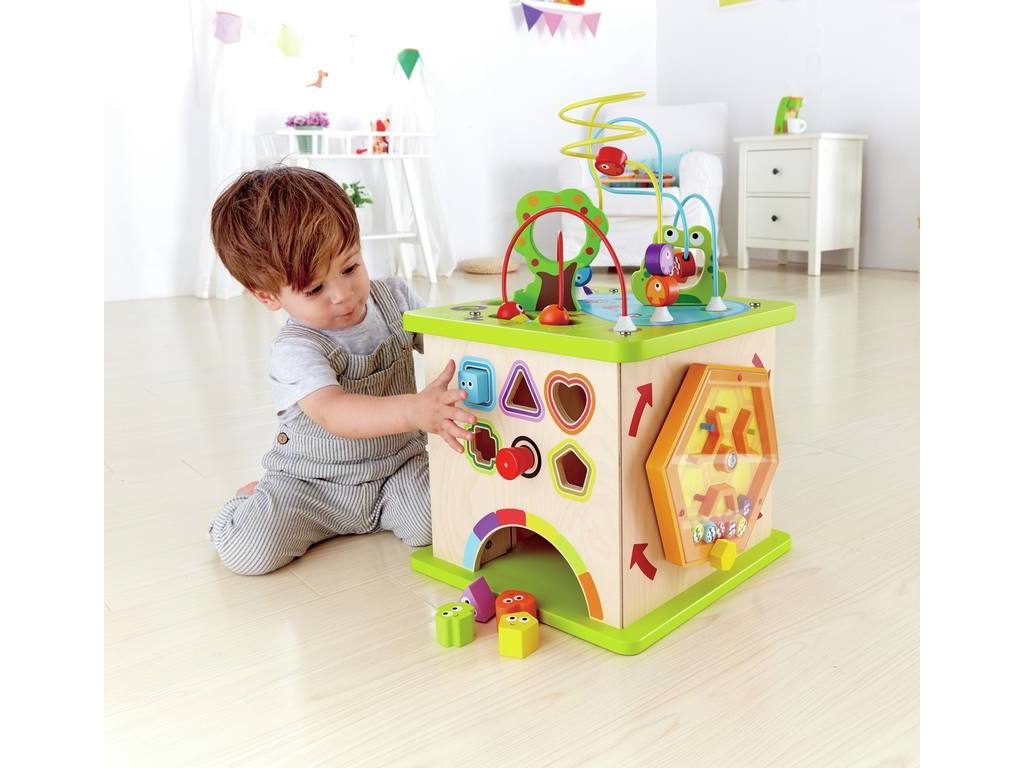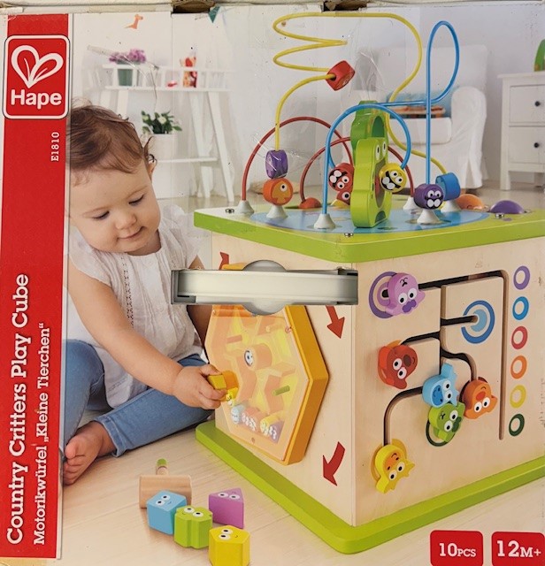 Abwechslung ohne Ende – das bietet der große Motorik-Würfel mit fünf Seiten: vielfältiges Motoriktraining mit süßen Kugeln an bunten Schleifen, ein buntes Sortierspiel und jede Menge anderer Spaß wie Hämmern und Drehen und sogar eine kleine Kugelbahn. Der Motorikwürfel ist ein echtes „Allround-Talent“.