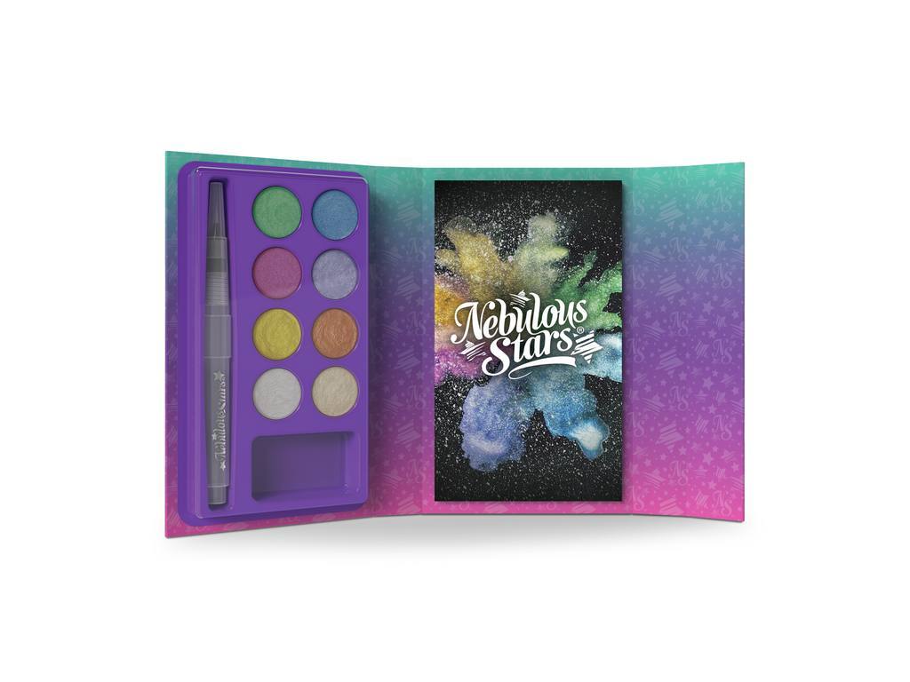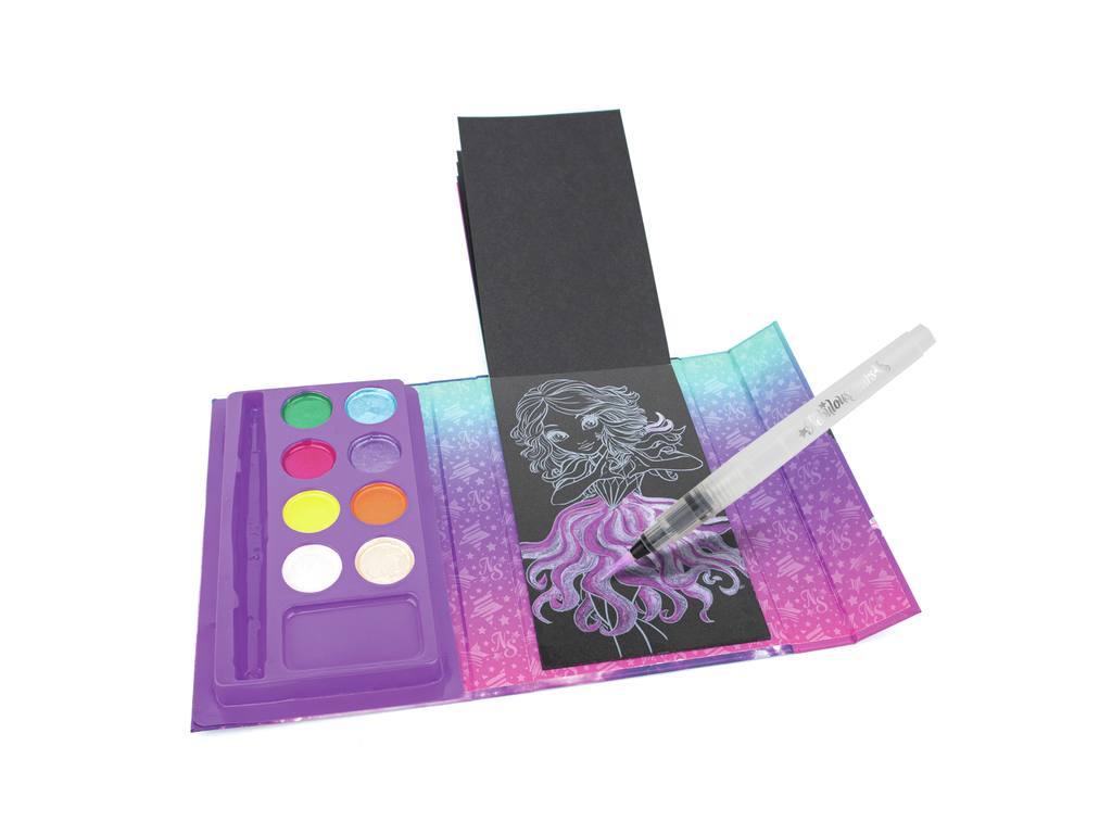 Die kleinen Künstler werden es lieben, dieses Aquarell-Skizzenbuch überallhin mitzunehmen! Das Set enthält einen nachfüllbaren Aquarellpinsel und 8 Metallic-Aquarellfarben! – 16 schwarze Seiten zum Ausmalen – 8 Metallic-Aquarellfarben – 1 nachfüllbarer Aquarellpinsel. Ab 7+