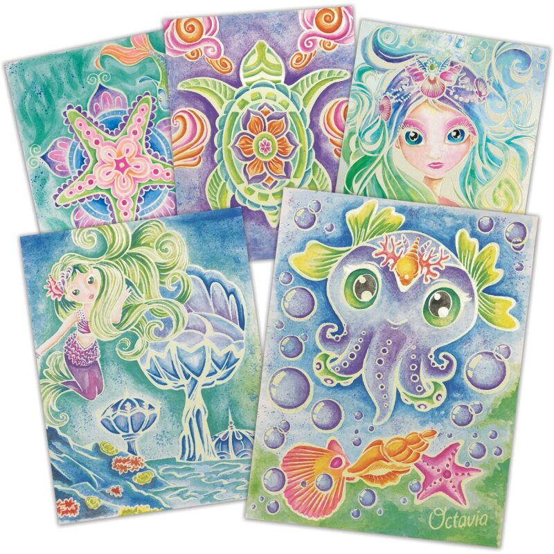 Mit dem Kreativset Magische Aquarelle können 5 wunderschöne und magische Aquarellbilder gestaltet werden. Das Set besteht aus 5 Vorlagen, 12 Aquarellfarben und 2 Pinseln. Die Vorlagen haben vorgemalte Konturen, welche im Dunkeln leuchten und verhindern, dass die Farben verlaufen. Auf der Rückseite ist eine bebilderte Anleitung aufgedruckt. Als Zugabe gibt es einen Flyer mit der Geschichte von Marinia. Nebulous Stars Artikel sprechen vor allem junge Mädchen im Alter von 7 bis 10 Jahre an. Künstlerische Aktivitäten fördern in Kombination mit den Geschichten der verschiedenen Charaktere die Kreativität und das Selbstwertgefühl.