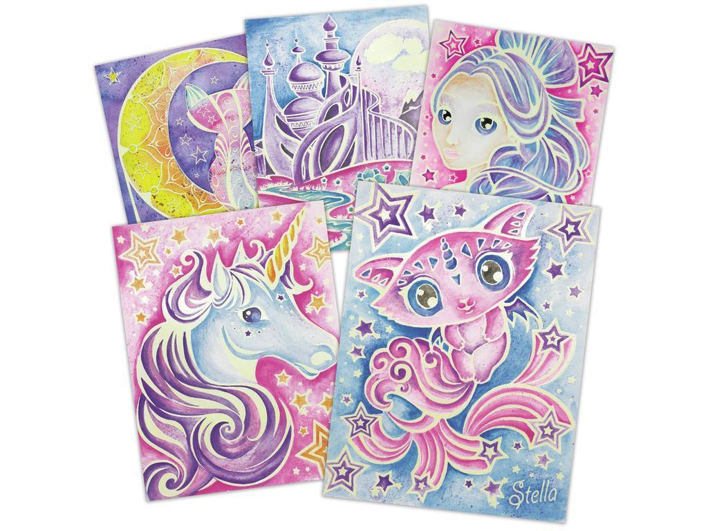 Male 5 wunderschöne magische Bilder. Die im Dunkeln leuchtende vorgemalte Strichzeichnung dient dazu, dass die Aquarellfarbe nur in den richtigen Bereichen bleibt. Wenn es fertig ist, leuchtet dein Kunstwerk im Dunkeln!