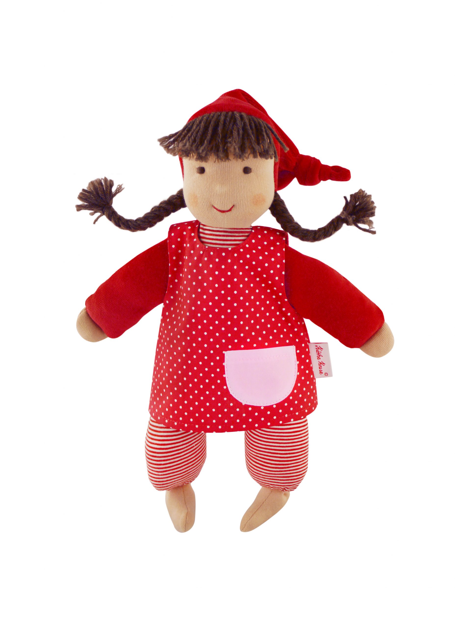 Die Colour Kids sind Teil unserer Waldorfserie und entsprechen mit ihrem minimalistischen Gesichtsausdruck den Waldorfrichtlinien. Schatzi rot ist 35 cm groß und hat braune Haare, die zu zwei Zöpfen geflochten sind. Sie hat einen weichen Körper und trägt ein rot-weiß gepunktetes Kleid und eine Zipfelmütze.