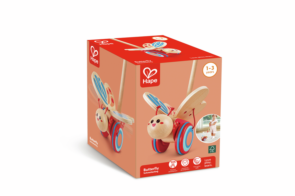 In die Hand nehmen und durch die Welt schieben oder ziehen. Der Effekt: Der Schmetterling flattert eindrucksvoll mit seinen Flügeln.