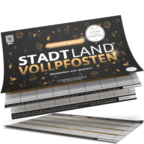 Macht den letzten Tag des Jahres unvergesslich mit der offiziellen Silvester-Edition von STADT LAND VOLLPFOSTEN. Der ultimative Spielblock mit 18 heiteren Kategorien rund um den Jahreswechsel für einen lustigen Silvester-Abend mit Freunden.