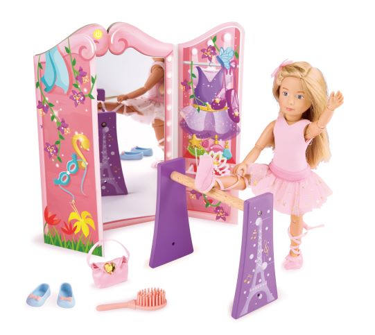 Tanzstunde bei den Kruselings. Vera hat sich ihr Ballett Outfit angezogen und übt fleißig für ihren großen Auftritt. Zum Set gehören Vera Puppe im Ballett Outfit, Ballettschuhe, Handtasche, Haarbürste, hölzerne Ballettstange und der aufstellbare Garderobenspielgel. Geeignet für Kinder ab 3 Jahren.