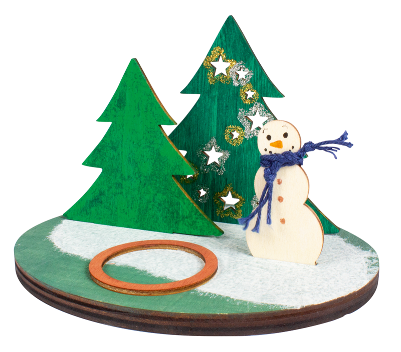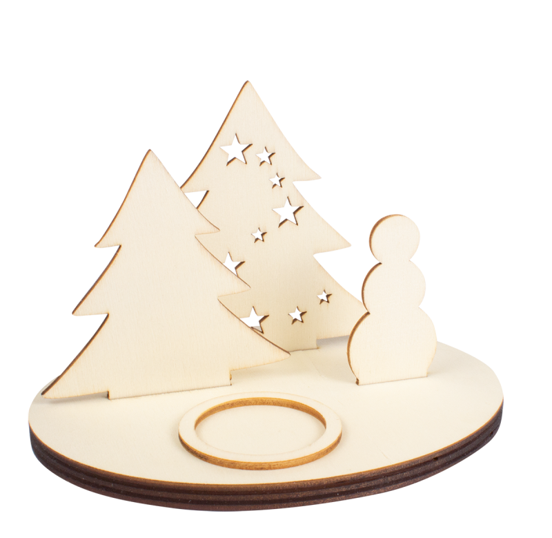 Dieses Winterwunderland steht mit zwei Bäumen und einem Schneemann auf einer Holzplatte. Das Produkt ist blanko und kann kreativ verziert und bemalt werden. Ideales Geschenk in der Adventszeit.